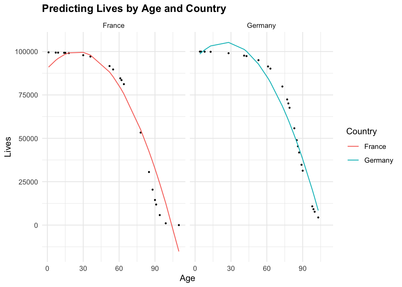 Let’s construct a GAM model to predict the number of lives based on age and country, using the poly() function to include a polynomial term for age: