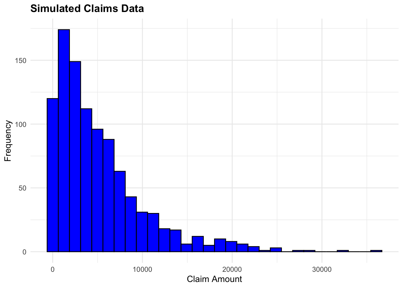 In this example we will simulate a dataset of claims data. We will assume that the claims follow an exponential distribution with a mean of 5000. We will simulate 1000 claims and plot the data.