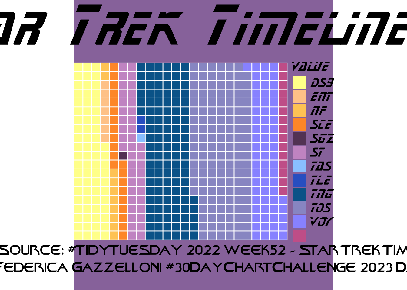 This Waffle is made of 12 different colors for identifying the SSeries. Here are used many colors from the trekcolors package for coloring the series of different colors.
