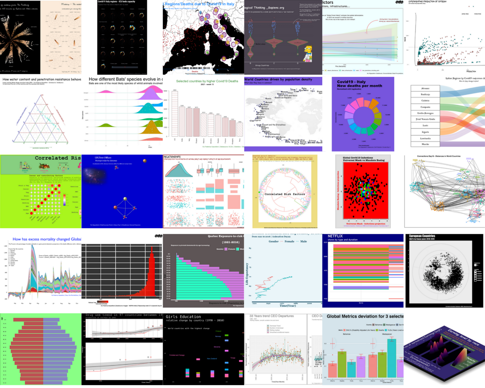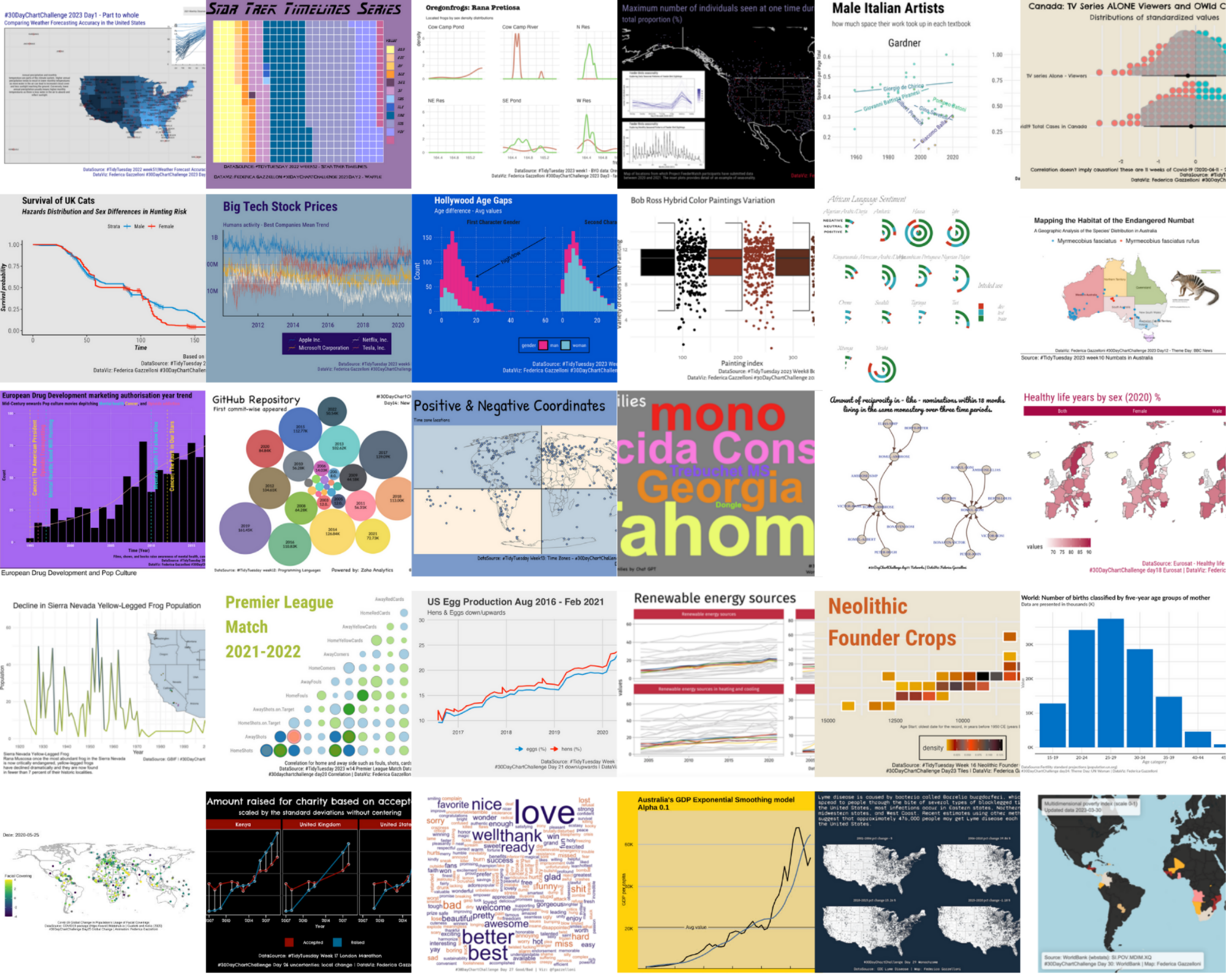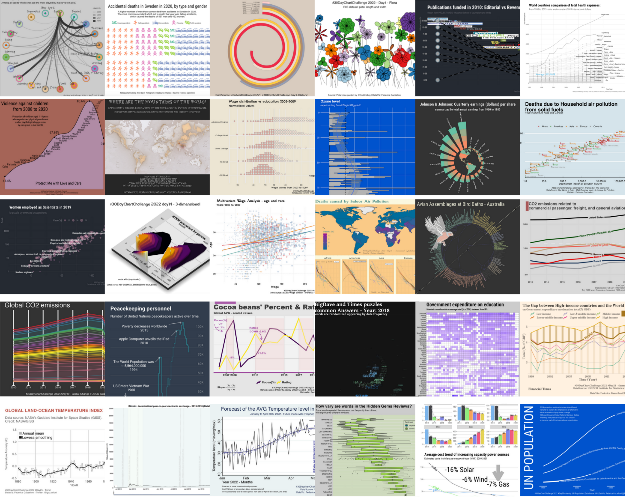 Here, I share a collection of charts that I’ve made using R. The project is called #30DayChartChallenge and it is taken every year in April. Each day brings a new chart, revealing different aspects of selected data through data visualization. It’s a creative journey that transforms numbers and information into eye-catching charts.