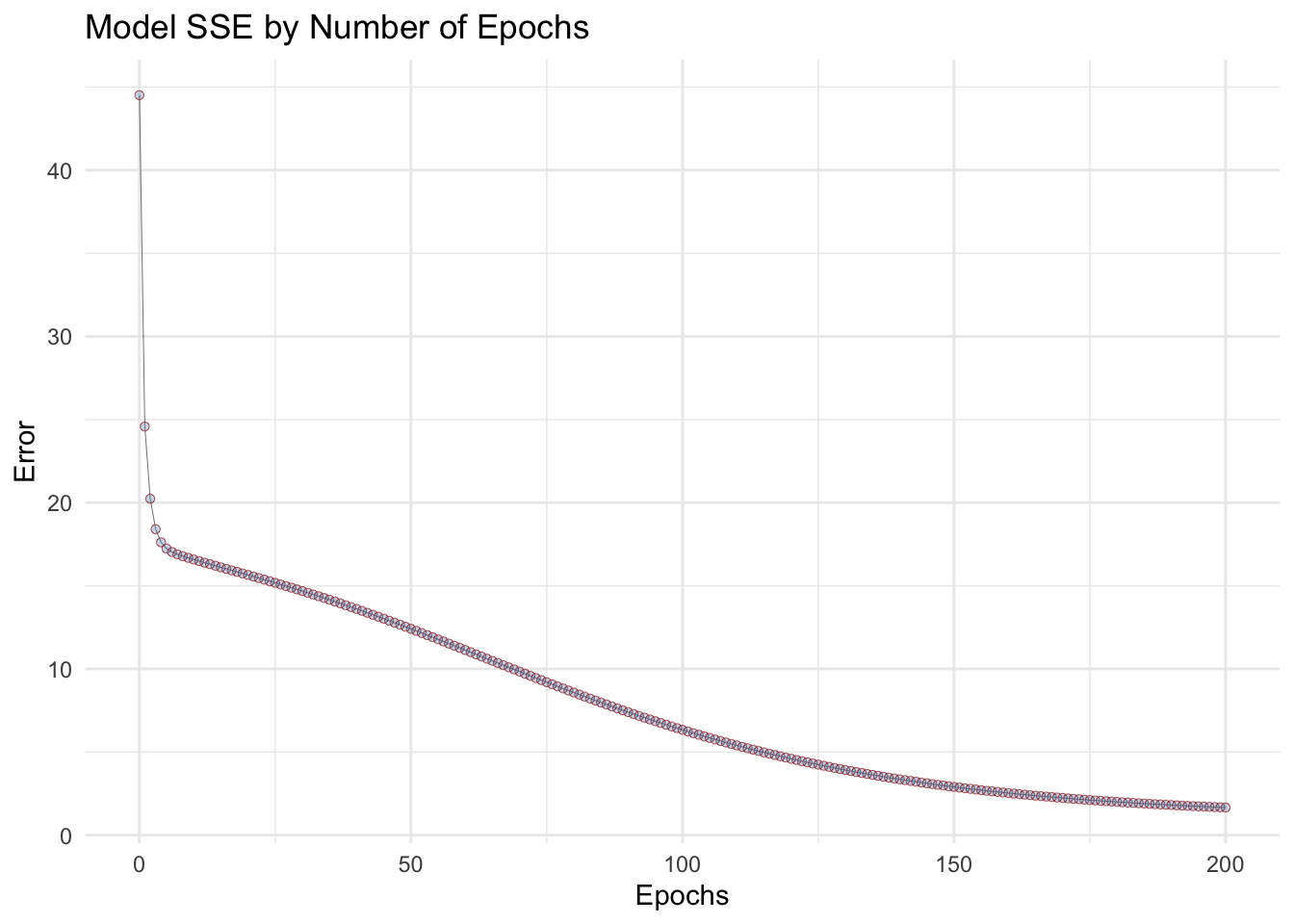 epochs = 200)Obtaining our adjusted SSE’s for each epoch:
