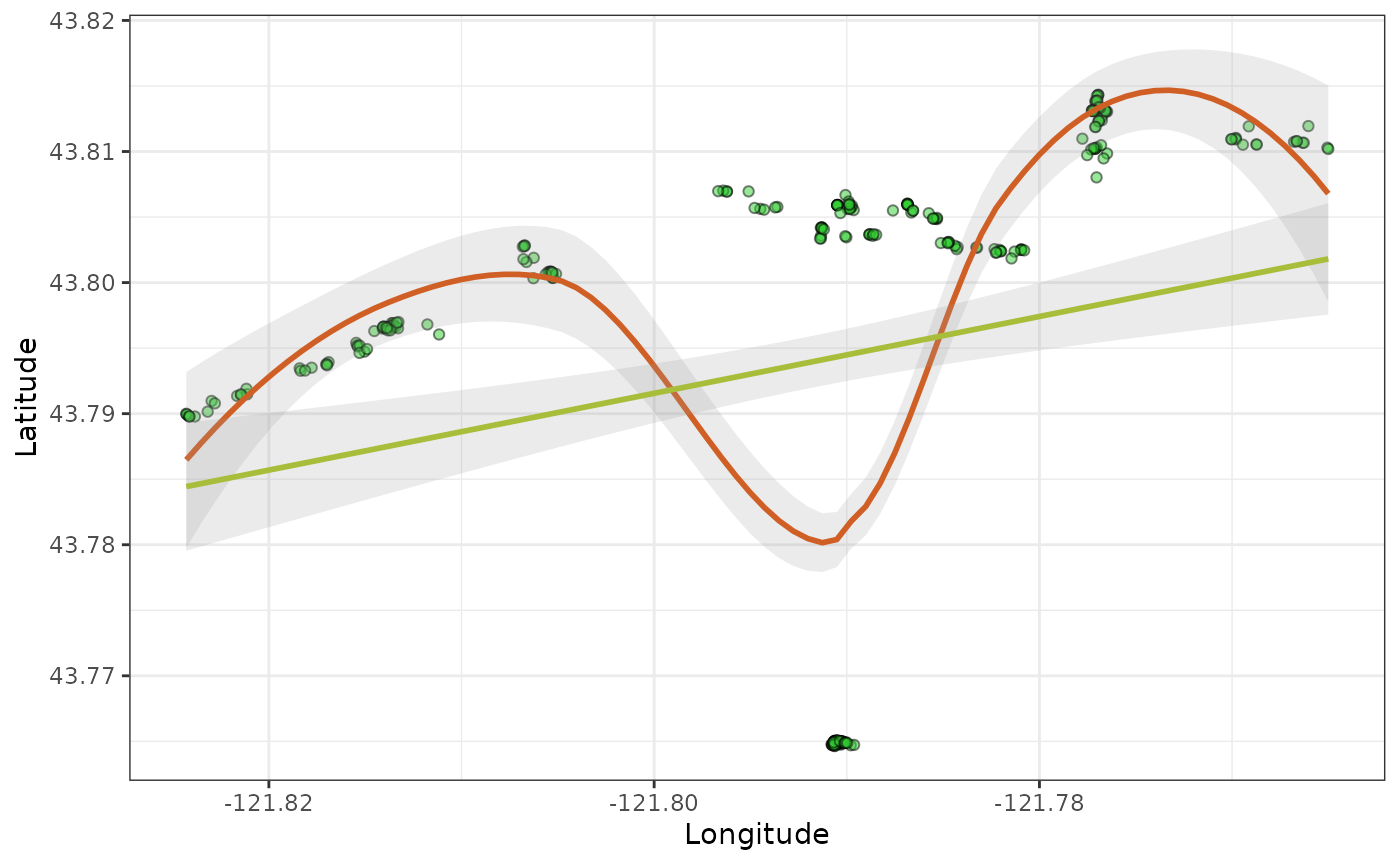ggplot2::geom_smooth() function shows two models the linear
